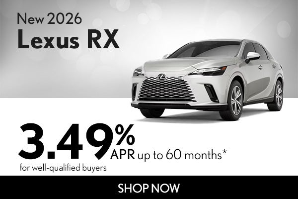 *Get 3.49% APR for 60 months on Select New 2026 Lexus RX (2026 RX 350, 2026 RX 350 AWD, 2026 RX 350 F SPORT DESIGN, 2026 RX 350 F SPORT DESIGN AWD, 2026 RX 350 F SPORT HANDLING AWD, 2026 RX 350 LUXURY, 2026 RX 350 LUXURY AWD, 2026 RX 350 PREMIUM, 2026 RX 350 PREMIUM AWD, 2026 RX 350 PREMIUM+, 2026 RX 350 PREMIUM+ AWD). 3.49% APR Financing for up to 60 Monthly Payments of $18.19 for every $1,000 Financed. Terms available on approved credit for only very well-qualified customers through participating Lexus dealers and Lexus Financial Services (LFS). No down payment required if qualified for advertised offer. Dealer contribution may vary and could affect price. Individual dealer prices, other terms and offers may vary. Must take retail delivery from dealer’s stock and terms subject to vehicle availability. This offer cannot be combined with Lexus Cash. See dealer for restrictions and exclusions. Offer expires 03-31-2026.