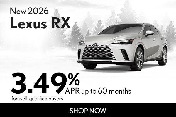 Get 3.49% APR for 60 months on Select New 2026 Lexus RX (2026 RX 350, 2026 RX 350 AWD, 2026 RX 350 F SPORT DESIGN, 2026 RX 350 F SPORT DESIGN AWD, 2026 RX 350 F SPORT HANDLING AWD, 2026 RX 350 LUXURY, 2026 RX 350 LUXURY AWD, 2026 RX 350 PREMIUM, 2026 RX 350 PREMIUM AWD, 2026 RX 350 PREMIUM+, 2026 RX 350 PREMIUM+ AWD). 3.49% APR Financing for up to 60 Monthly Payments of $18.19 for every $1,000 Financed. Terms available on approved credit for only very well-qualified customers through participating Lexus dealers and Lexus Financial Services (LFS). No down payment required if qualified for advertised offer. Dealer contribution may vary and could affect price. Individual dealer prices, other terms and offers may vary. Must take retail delivery from dealer’s stock and terms subject to vehicle availability. This offer cannot be combined with Lexus Cash. See dealer for restrictions and exclusions. Offer expires 03-02-2026.